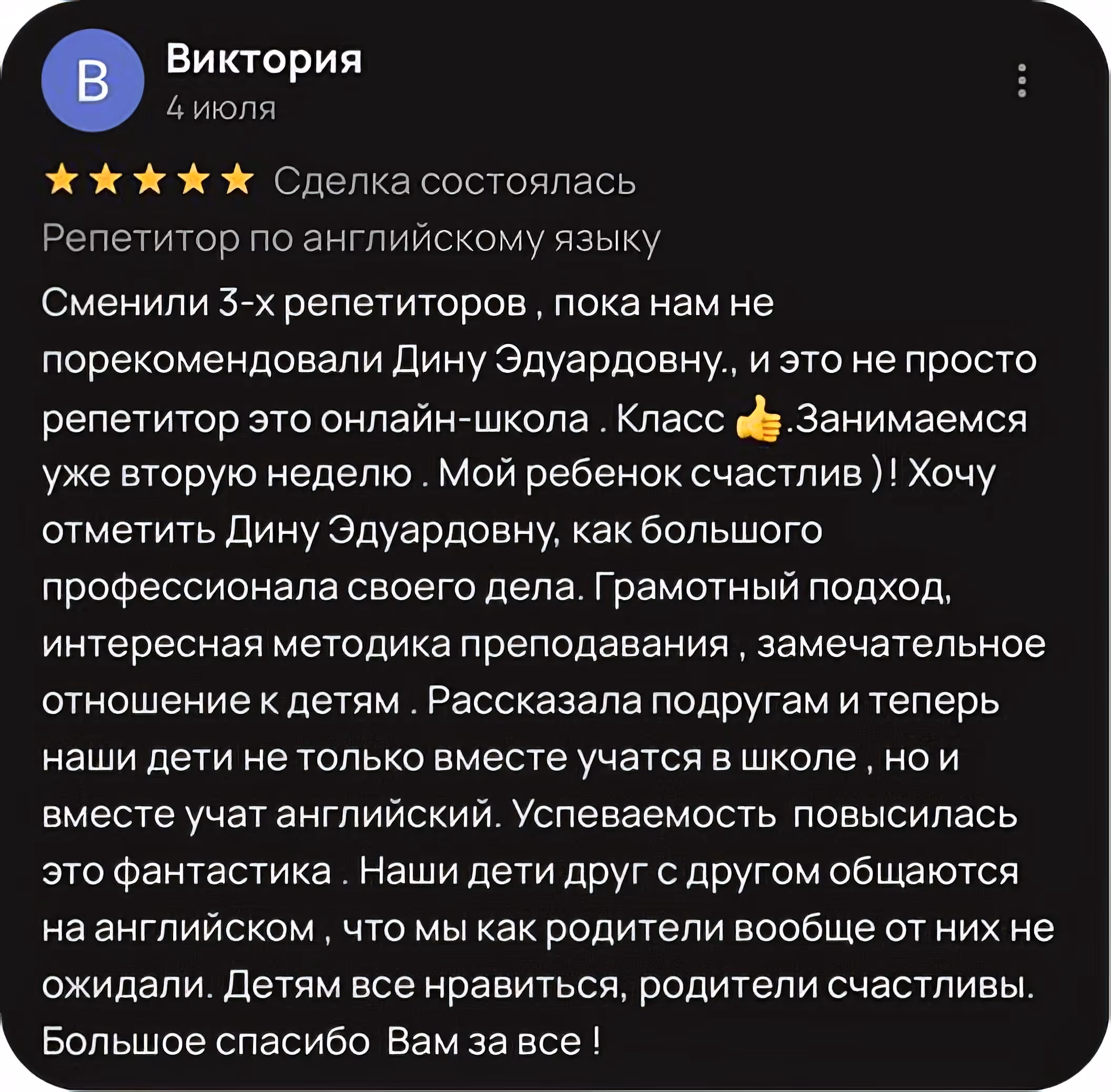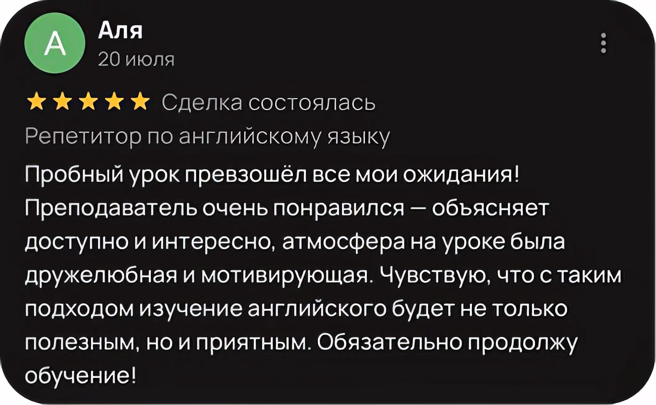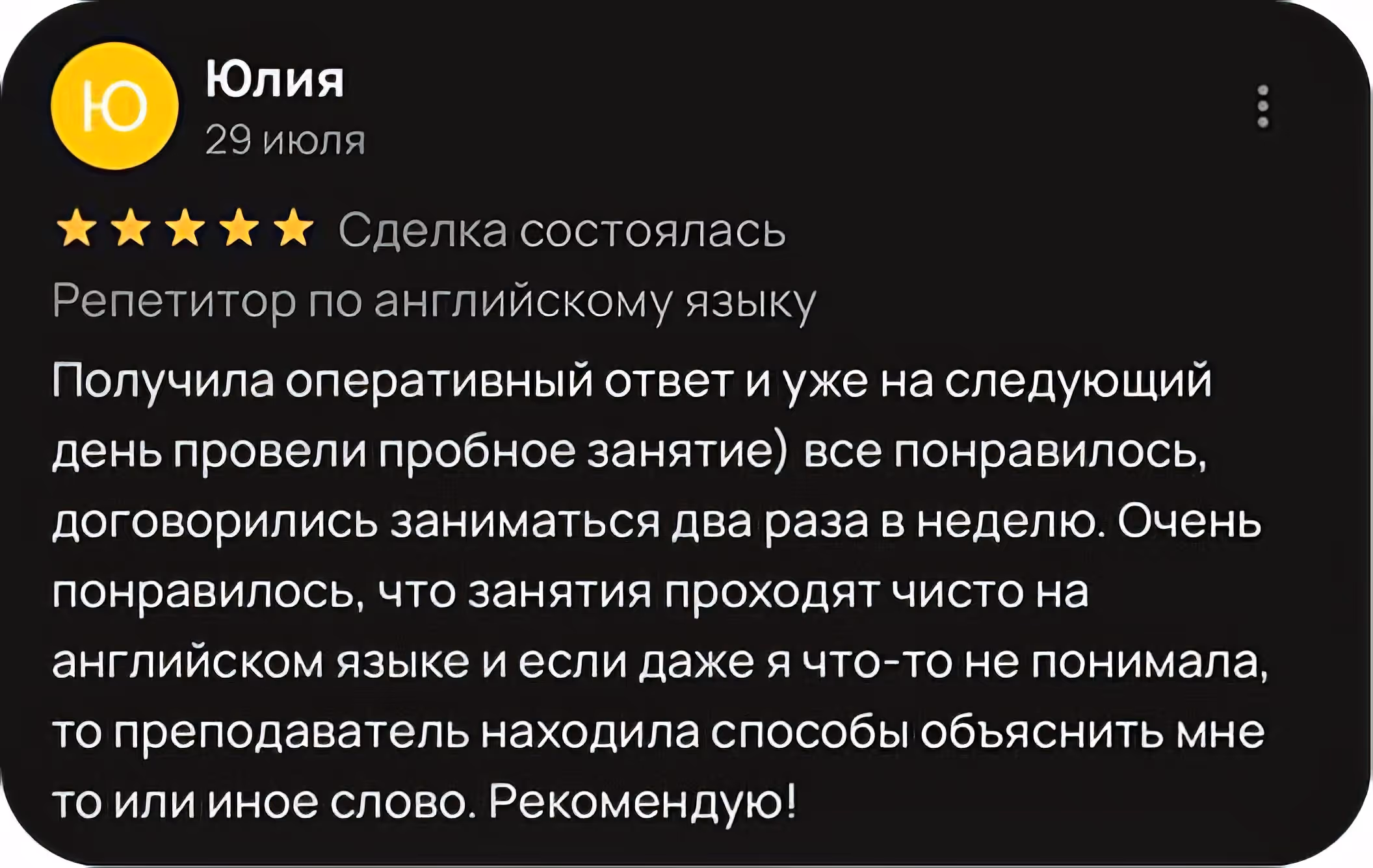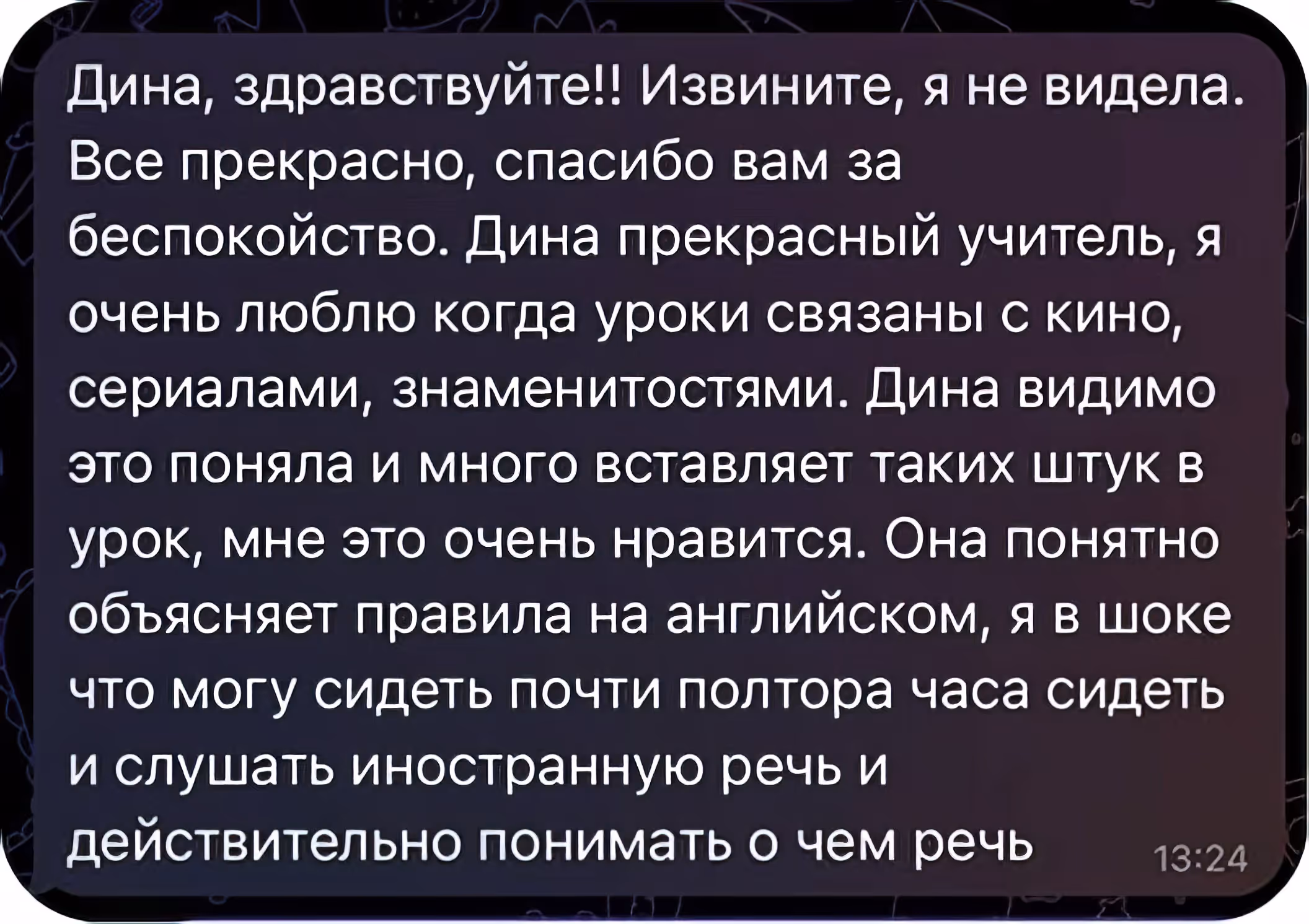 С вами будут работать молодые специалисты, для которых английский — это не просто профессия, а увлечение всей жизни. Они сами прошли путь изучения языка и знают все подводные камни. Их энергия и страсть заразительны — они умеют мотивировать и «разжигать» любовь к английскому даже у тех, кто когда-то разочаровался.