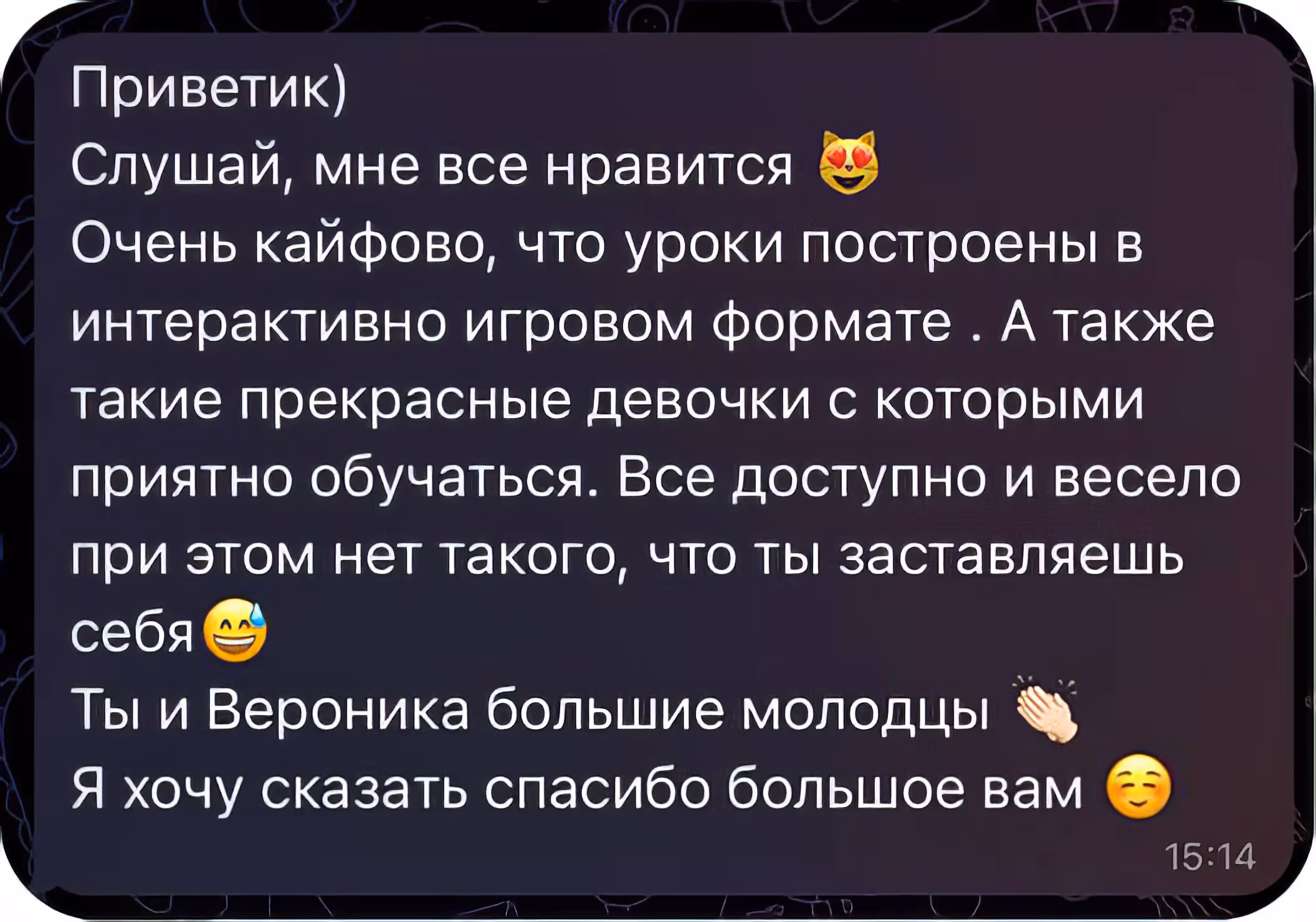 Мы не обещаем волшебства за 2 дня, но мы гарантируем, что каждое ваше занятие будет уверенным шагом к свободному общению. Мы создали сообщество, где комфортно и интересно учиться, совершать ошибки и, наконец, преодолеть языковой барьер.